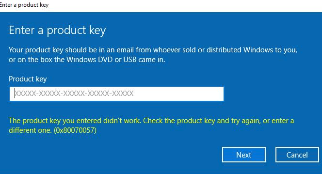 The product key you entered didn't work. Check the product key and try again, or enter a different one. (0x80070057)